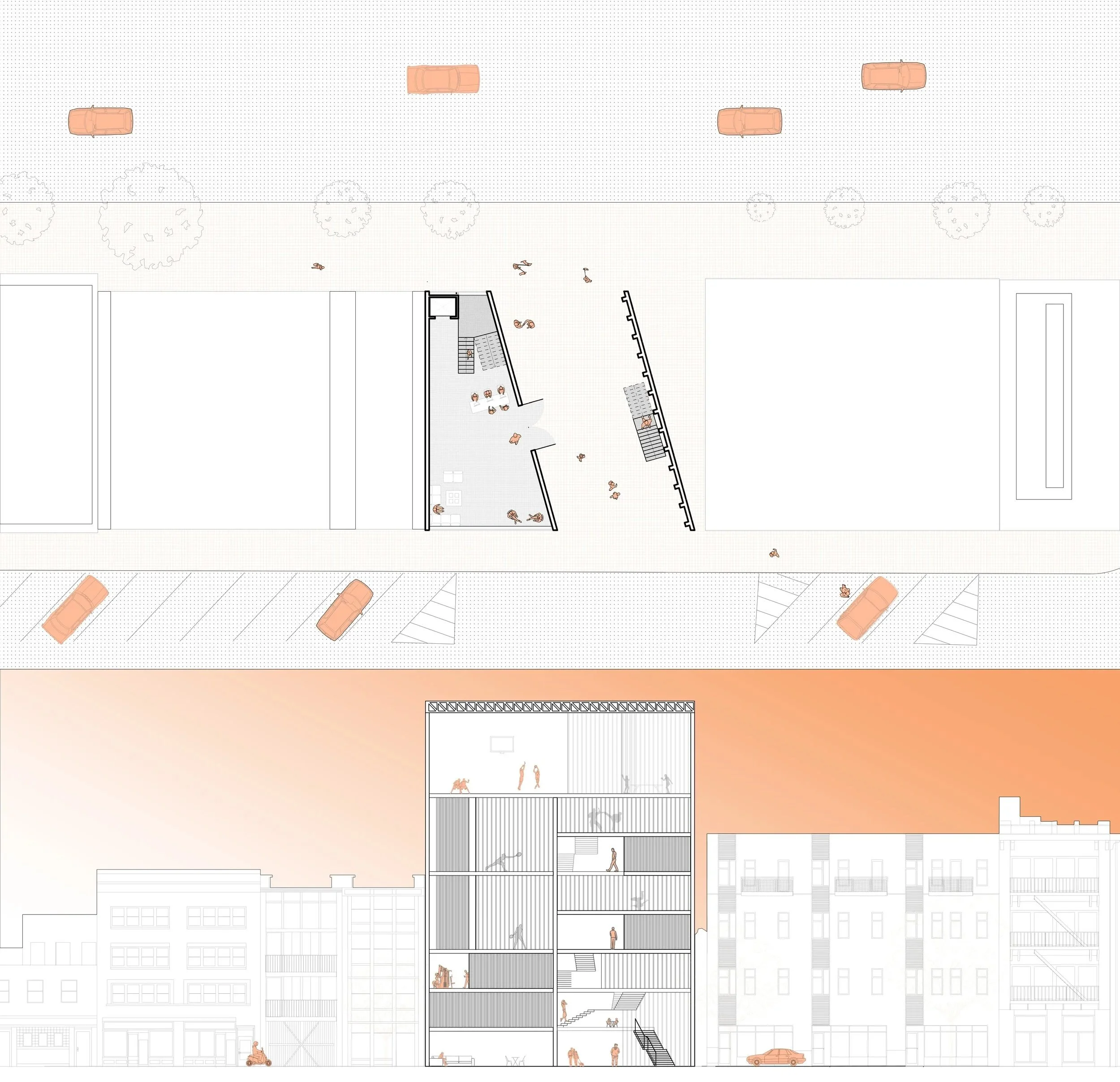 Read together, the section and elevation depict activities in motion. The central wall acts as structure, sound buffer, and spatial threshold, separating loud and quiet programs while maintaining continuity.